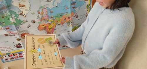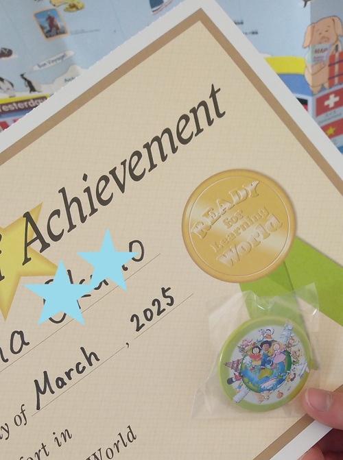 全問クリアしたら、テキスト巻末にあるCertificate に先生のサインをして、缶バッジと一緒に、1人1人に渡します。