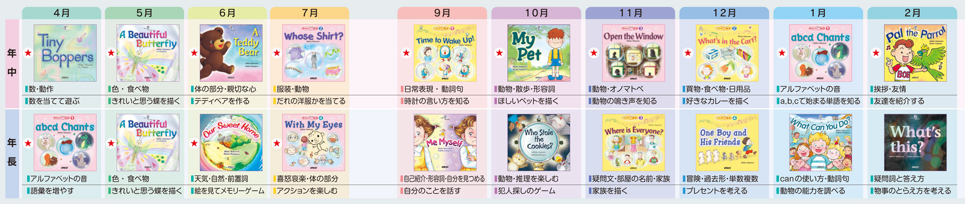 子供達は全てが新しいことではなく「あ、聞いたことある、知ってる、覚えてる!」から入ることができるので、自分が英語を知っていることを実感でき(小さな成功感)、その後の学習へのモチベーションに繋がりやすくなります。1度で終わらないため、強く長く記憶することができます。