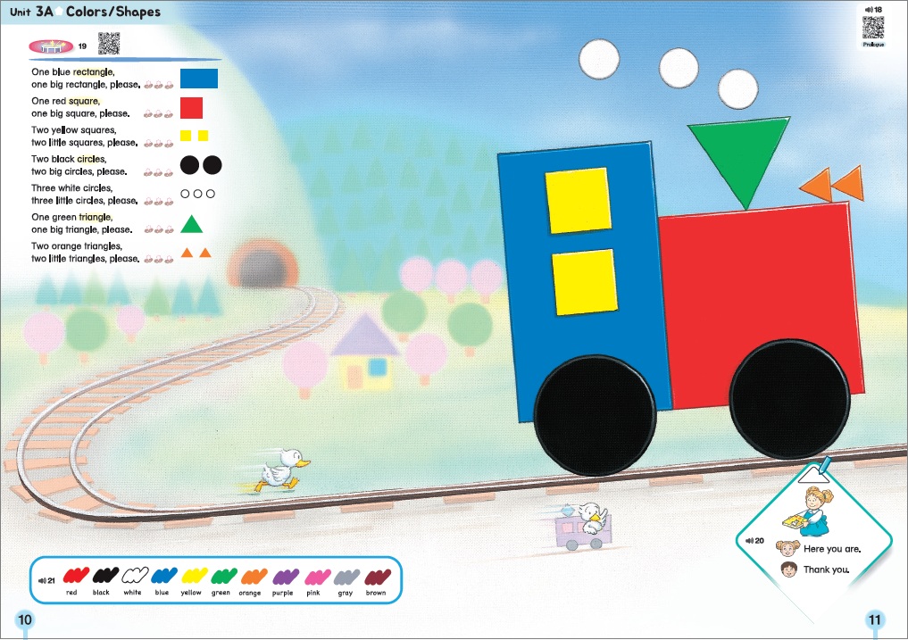 Comprises 10 units. Learns greetings, numbers, colors, family, animals, food, vegetables, body parts, vehicles, shapes, seasons, uppercase letters, and lowercase letters, primarily through songs and chants.