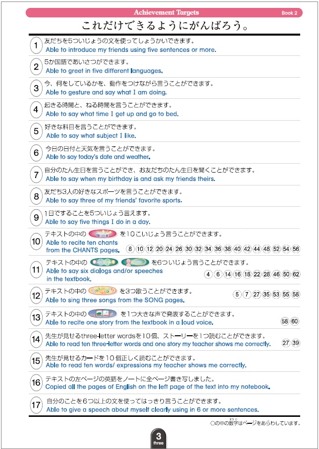 Learning Worldシリーズには、各巻の冒頭にAchievement Target(Can-doリスト)があり、テキストの巻頭ページに箇条書きで課題がバイリンガルで印刷されています。使い方はこちら