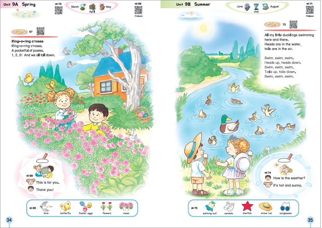 見開きページごとにフルカラーの絵が展開され、歌、チャンツ、Andy & Sarahの会話があります。