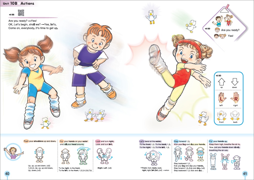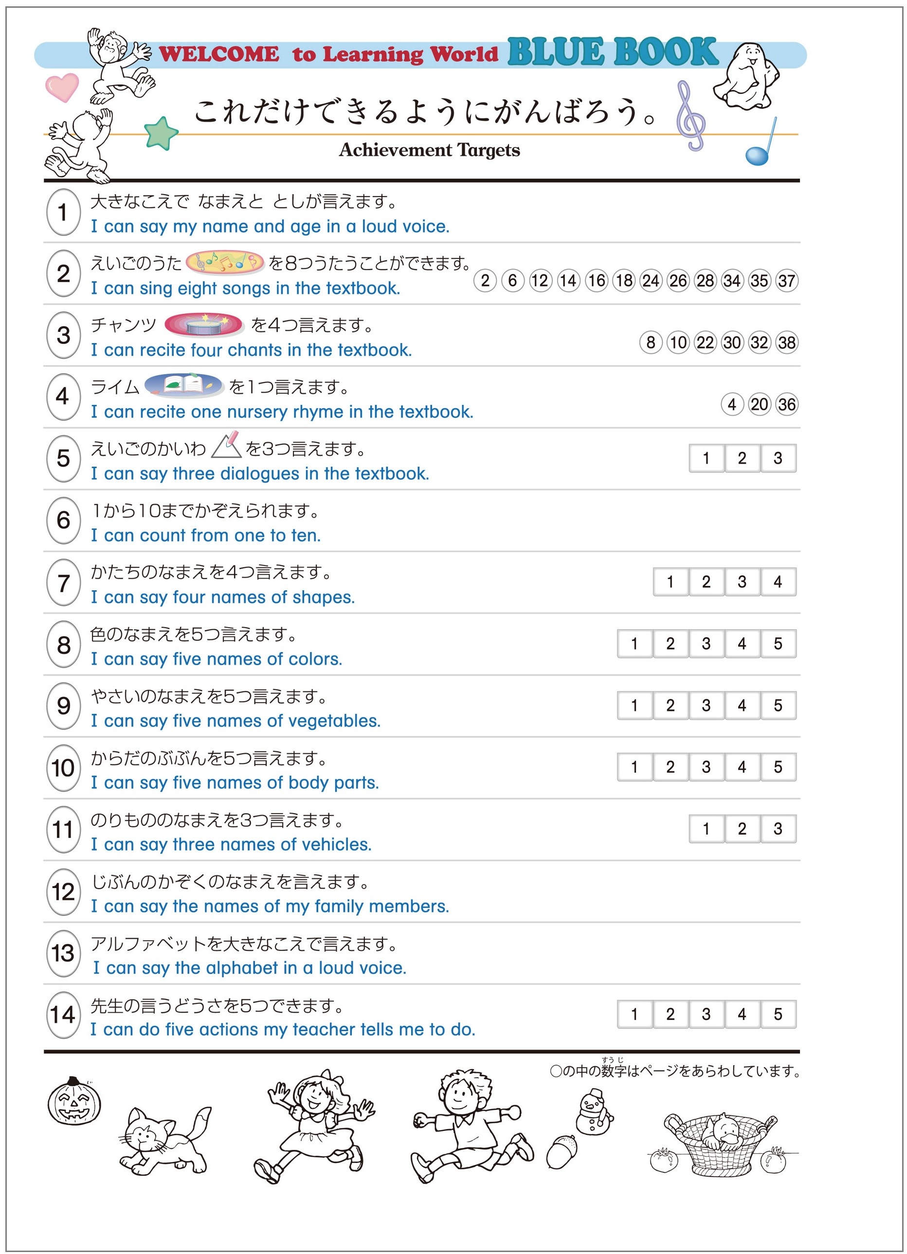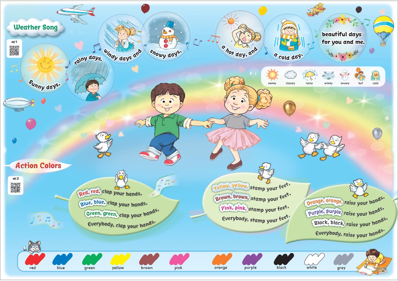 10ユニット構成。あいさつ、数、色、家族、動物、食べ物、野菜、身体の部分、乗り物、カタチ、季節、アルファベット大文字、小文字を、歌とチャンツ中心に学びます。