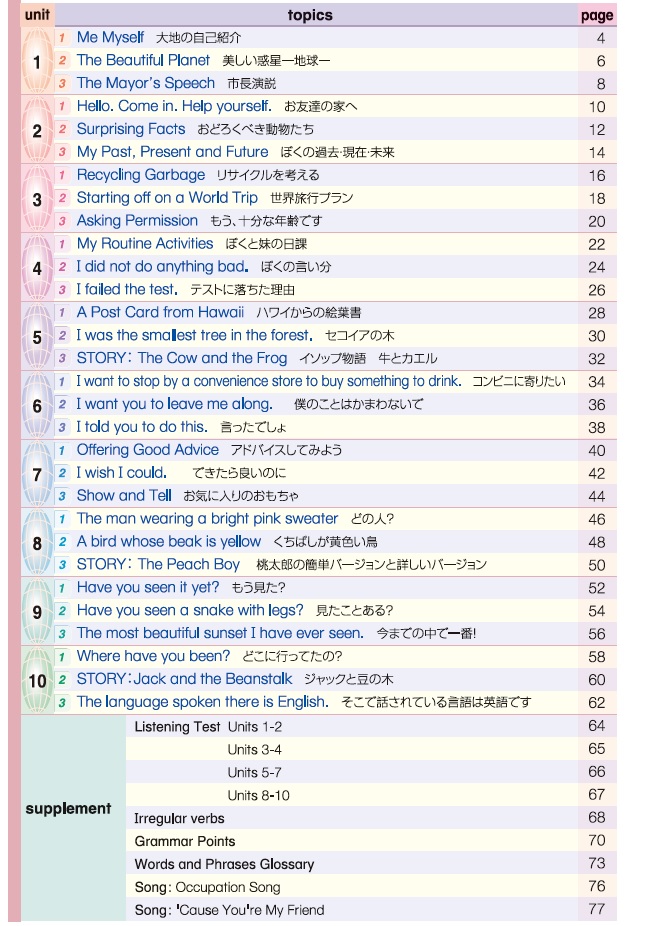 全10ユニットのうち、前半のユニットは既習の文型を使って、より深く、より現実に即した英語を使えるように構成されています。