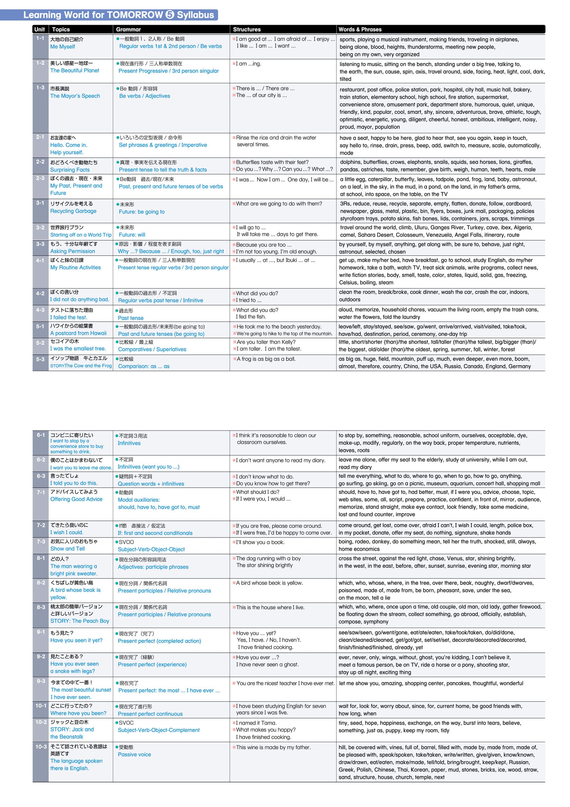 ●Learning World 5 for TOMORROW の学習内容 ※クリックで拡大