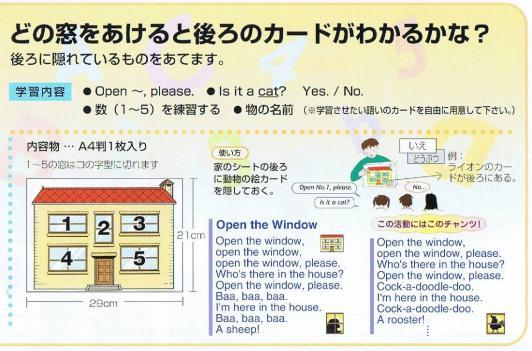 【使い方】窓のカードの後ろに動物カードを隠します。チャンツOpen the Windowに合わせて、子供達に開けてほしい窓の番号を言わせて、窓から見える部分で、動物の名前をあてましょう。